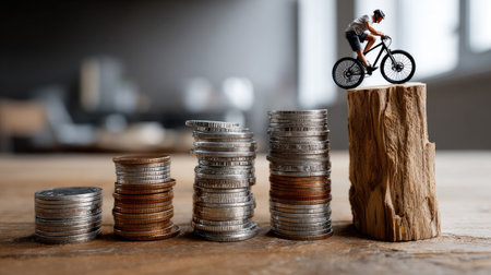 A whimsical scene featuring a miniature cyclist on a wooden log, balancing above stacks of coins, symbolizing adventure, finance, and challenge in a creative setting.