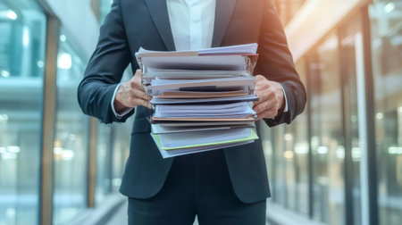 Business professional in a suit carries a large stack of documents, symbolizing multitasking, time management, and workplace stress. The setting suggests a busy office environment