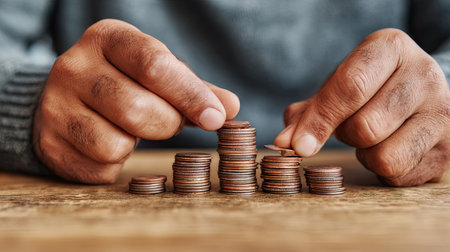 A focused view of hands stacking coins on a wooden surface illustrates the concept of financial planning, savings, and money management.