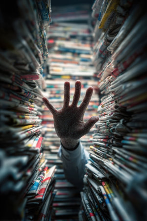 Hand reaches out through stacks of newspapers. Concept of information overload, media pressure, and excessive news consumption