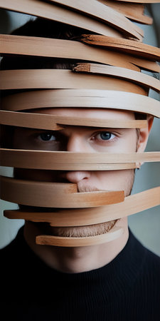 Surreal Portrait of Caucasian Man with Face Obscured by Wooden Layers, Eyes Peering Through Mystery