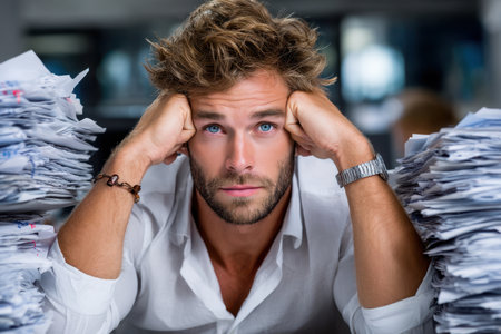 Young man with blue eyes shows visible stress while resting on his arms in a cluttered office filled with papers.