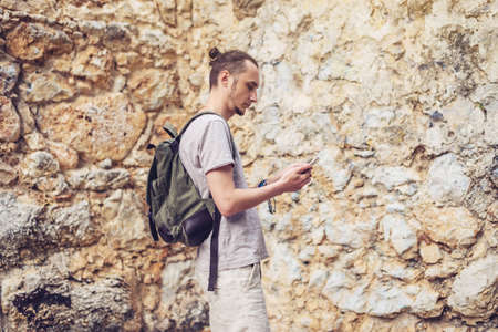 Man traveler with backpack looking at his smartphone on the background of a stone wall. The concept of connection and communication in the journey.