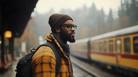Guy tourist with a backpack travels alone. A man is waiting for his train and enjoys a view of the mountains.