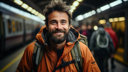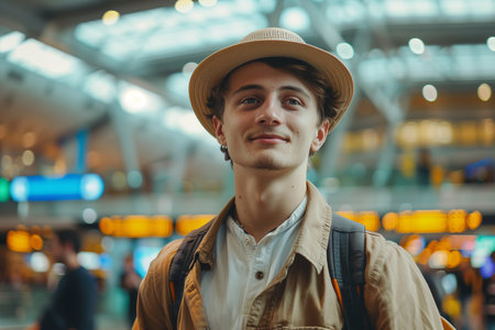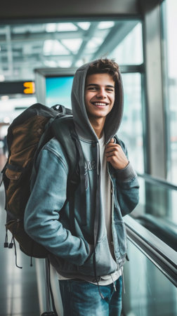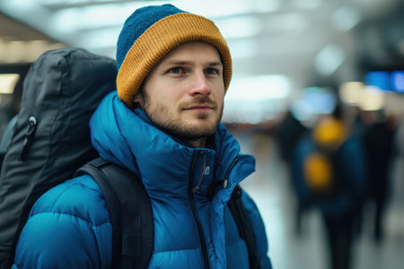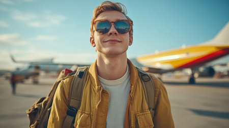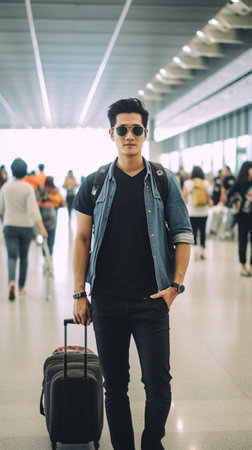 Confident tourist man in a blue jacket ready for his travel adventure at the airport, representing exploration, holidays, and global journeys.
