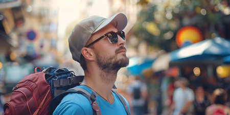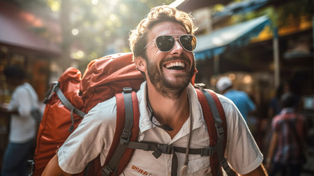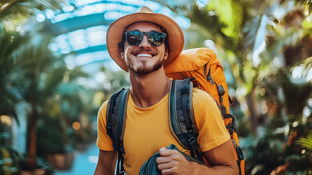 Smiling man with backpack, wearing sunglasses and hat, amidst lush green foliage. Bright, vibrant colors, outdoor setting, ideal for travel or lifestyle advertising.