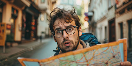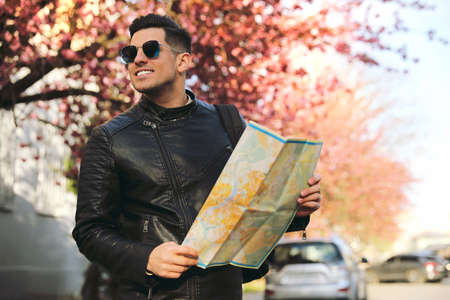 Stylish young man holding a map, exploring the city from a well-parked spot. Copy space.