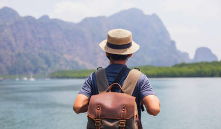 Traveller man standing at mangrove forest by the sea with mountain in nature background.Beautiful landscape for adventure travel.