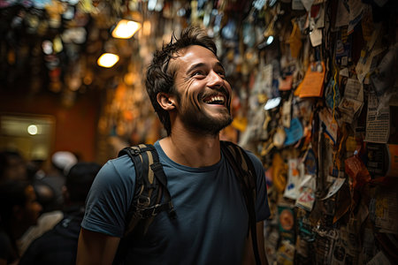 A young man wearing a shirt that says Tungsram is smiling in a busy airport