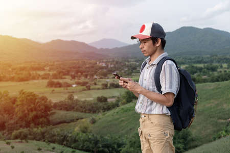 Freedom traveler man standing ,Image with sunrise effect filte,A man carrying a bag,Using phone,copy space