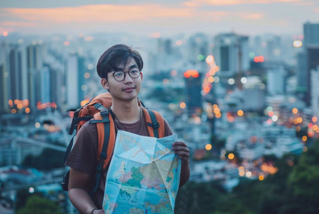 Asia tourist looking at map. Beautiful tourist attractions. generative ai