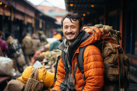 Handsome young man with backpack hiking on the Great Wall of China in autumn. Generative AI.