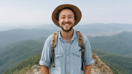 A cheerful young man stands on a mountain peak, smiling widely against a backdrop of lush green hills and a cloudy sky, embodying adventure and freedom in nature.