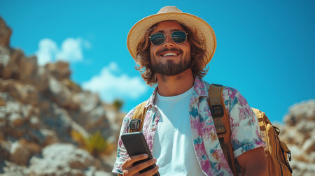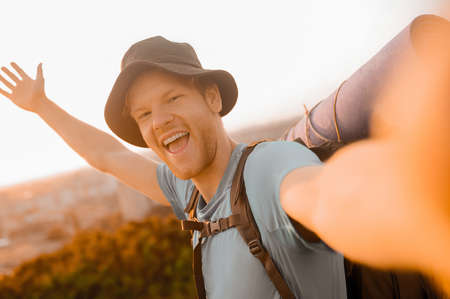 Generative AI : Handsome man taking selfie pic with smart mobile phone outside at golden hour time Traveler guy with backpack enjoying day out on summer vacation Happy tourist ha