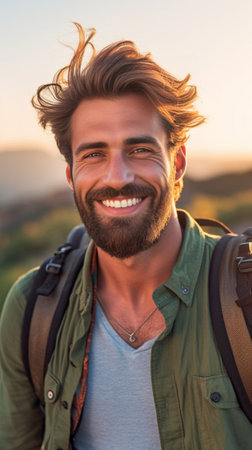 A young man with a backpack enjoys a peaceful moment outdoors, smiling warmly as the sun sets behind scenic mountains and lush trees.