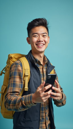 Generative AI : Asian casual smart man lifestyle using mobile phone connection concept At airport
