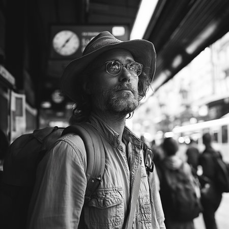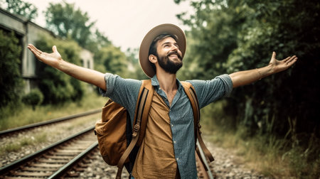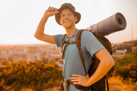 Enjoying early morning hike Handsome young man in fedora carrying backpack and smiling while walking outdoors : Generative AI