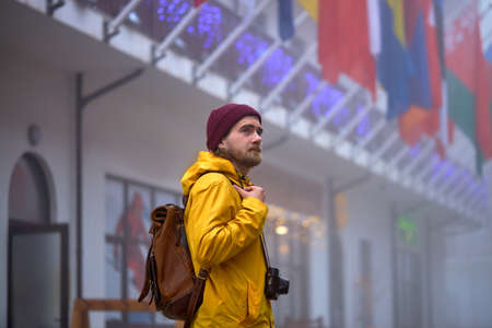 Young Male Traveler in yellow coat and hat with camera relaxing outdoors at foggy weather. vacations and Lifestyle hiking concept. Tourism, travel, trip, nature, people lifestyle concept. side view