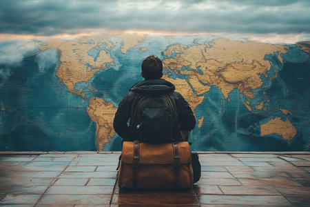 Young man with a blue backpack stands in front of a large world map, contemplating travel destinations and global exploration.