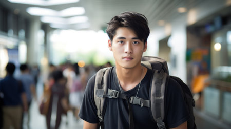 Asian student with a backpack at university. Young refugee man. Concept of immigrant education, refugee resilience, international education, diversity, cultural integration.