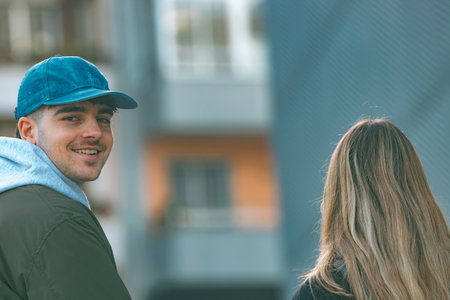 boy and girl couple on the street outdoors talking