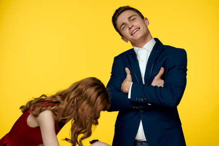 Young charming couple rose relationship romance gift as a lifestyle yellow isolated background