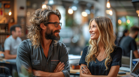 Two business colleagues are enjoying a friendly conversation in a modern office environment