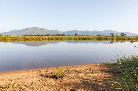 Kruger National Park, reflections on lake, tree and wildlife. Beautiful landscape from South Africa. Safari and nature