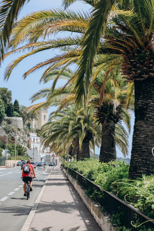 Nice, France - 01 June 2023: Palm trees along the road between Nice and Villefranche sur Mer, on the French Riviera