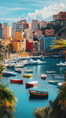 Melilla Marina showcases a picturesque harbor filled with colorful boats gently swaying in the water, framed by modern buildings and lush palm trees under a bright sky.
