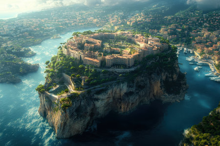 An impressive aerial view captures a coastal fortress city perched on a rocky cliff overlooking the ocean. Lush greenery adorns the site, complementing scattered boats in the serene water.