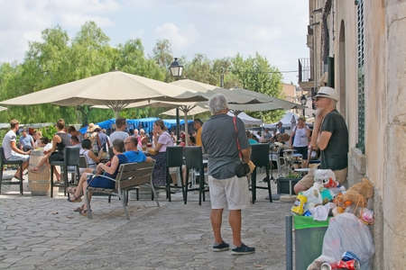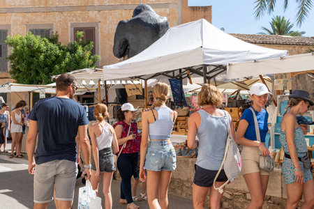 MALLORCA, SPAIN - SEPTEMBER 5, 2018: People visiting the Sineu market on a sunny day on September 5, 2018 in Mallorca, Spain.
