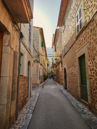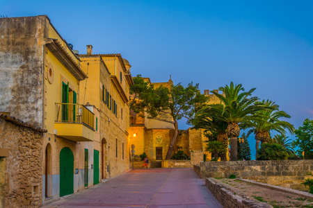 Sunset view of a narrow street in the old town of Alcudia, Mallorca, Spain