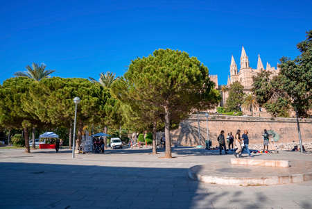 Tourists and street sellers on promenade against La Seu Cathedral