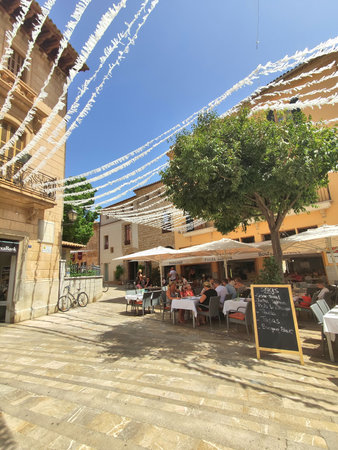 ALCUDIA, SPAIN - AUGUST 10, 2019: Restaurant tables on square in seaside Alcudia old town, Mallorca island, Spain.