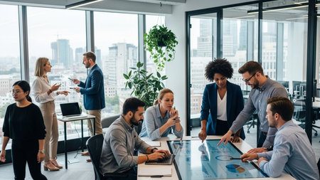 A group of professionals works in a bright, contemporary office setting. Natural sunlight illuminates the scene, highlighting the modern decor and diverse team engaged in various tasks. The composition features individuals at desks and collaborating, suggesting a collaborative and productive atmosphere. Suitable for commercial or editorial applications related to business.