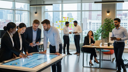 Team of dynamic executives analyzing data on grand screen in panoramic office space