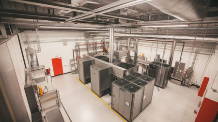 A spacious high-tech industrial facility showcasing advanced equipment arranged neatly within a modern infrastructure designed for optimal efficiency and safety.