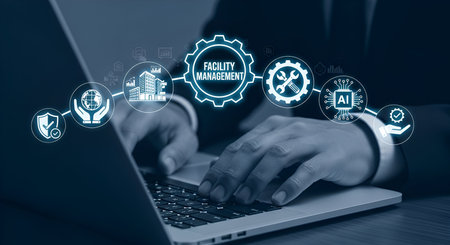 A person's hands are typing on a laptop keyboard, with a digital overlay of facility management icons and concepts. The icons include gears, AI, a building, a globe, a shield, and tools, arranged in a circular flow around the central text FACILITY MANAGEMENT. The overall image conveys a sense of digital integration and technological advancement in managing business facilities and operations.