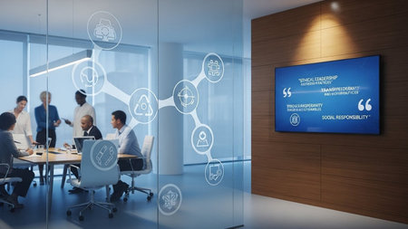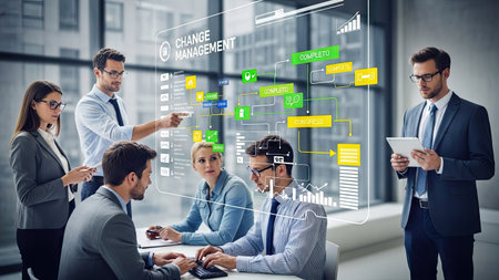 A business team gathers around a table, interacting with projected graphics depicting change management processes. They are dressed in business attire. The scene is illuminated by ambient interior lighting, with digital overlays suggesting data analysis. Suitable for use in business and financial publications, and advertising materials.