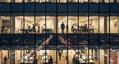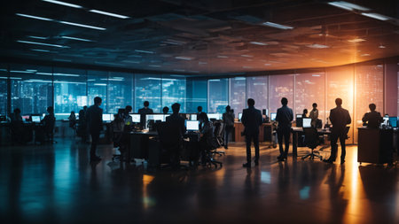 Silhouette of business people in modern office with night city view