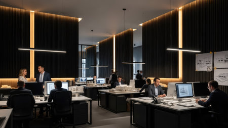 An interior shot depicts a modern office space with numerous desks and computer setups. People are seen interacting and working at their workstations. The scene features a balanced composition, with warm lighting and a contemporary style. This image is suitable for commercial and editorial applications illustrating office environments and business activities.