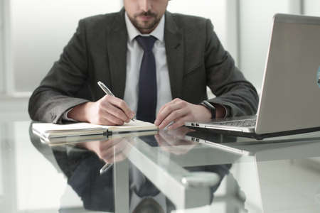 The head of the company works in the office at a glass table