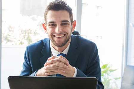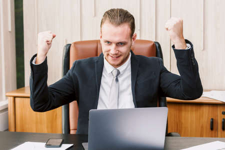 Young happy businessman in a suit indoors