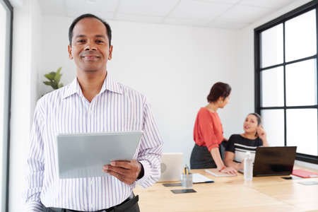 Portrait of mature male leader standing with digital tablet and smiling at camera while two businesswomen working at the table in the background