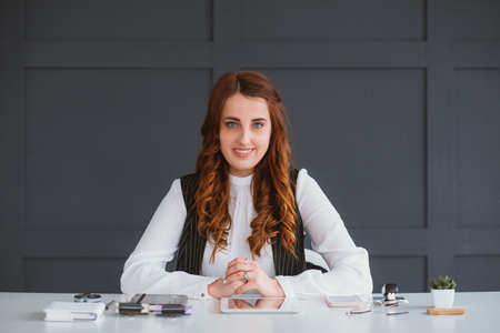 SMM expert at work. Business woman sitting at perfectly tidy desk. Professional attitude, guaranteed result. Consultation.