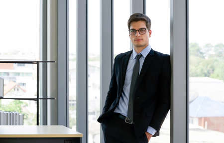 Young businessmen in suits and tie put his hand in the pocket pant while leaning against a glass wall in the office. Morning work atmosphere In a modern office.