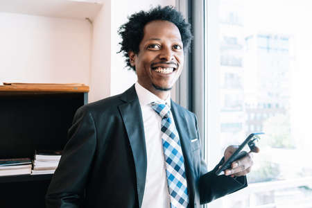 Portrait of businessman dressed in formal clothes using mobile phone standing inside near glass at building.