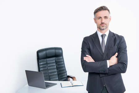 mature boss wear suit in office on white background