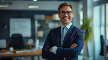 Happy young businessman with his arms crossed on chest standing against office environment